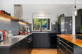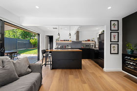 The contemporary kitchen is the true heart of the home, boasting a sleek design, an expansive custom benchtop, and generous storage - perfect for family meals or hosting. Carefully designed for both everyday living and entertaining, it features modern fixtures and a generous layout perfectly suited to family life.